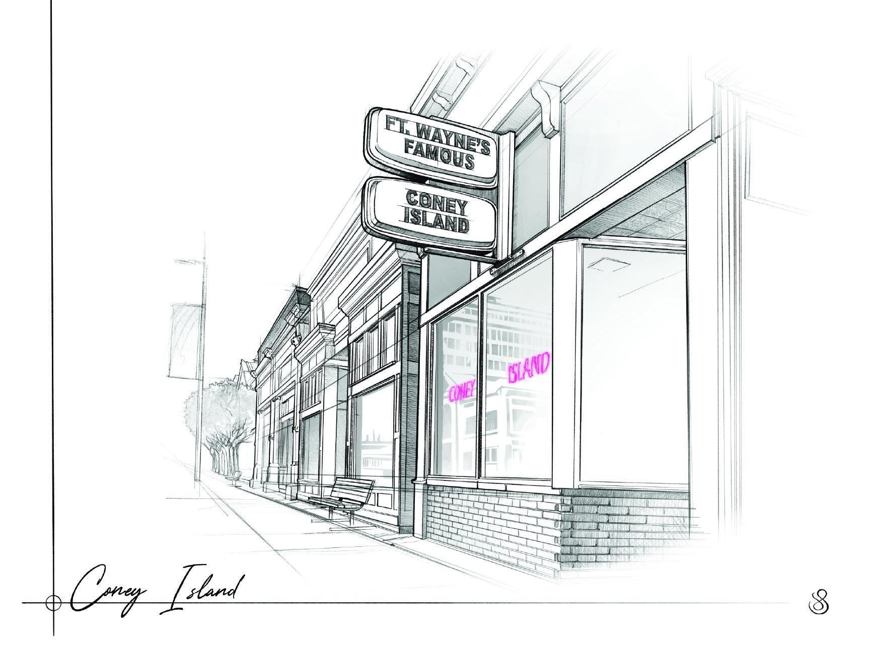 18x24” Hand drawn architectural sketch of Fort Wayne’s Famous Coney Island by artist J. Selzer.