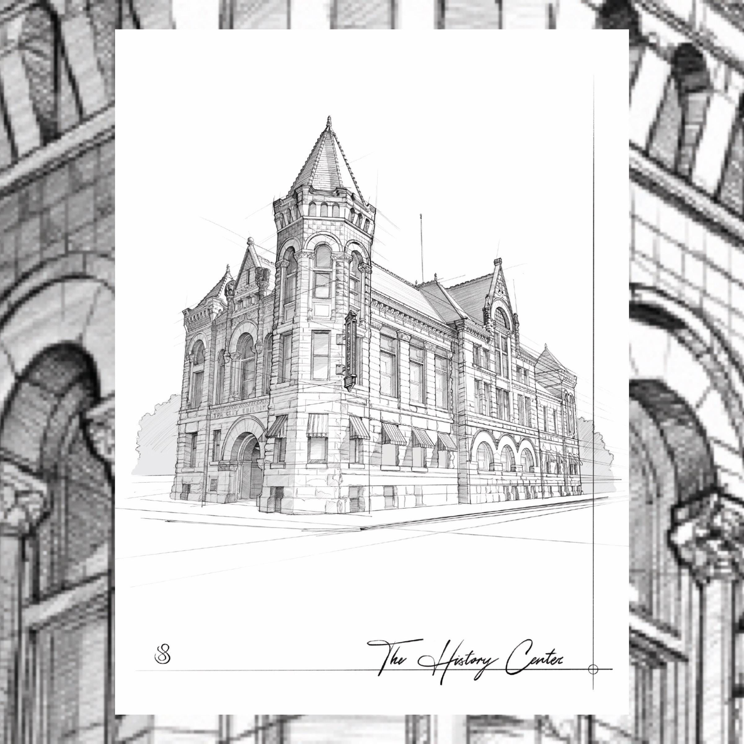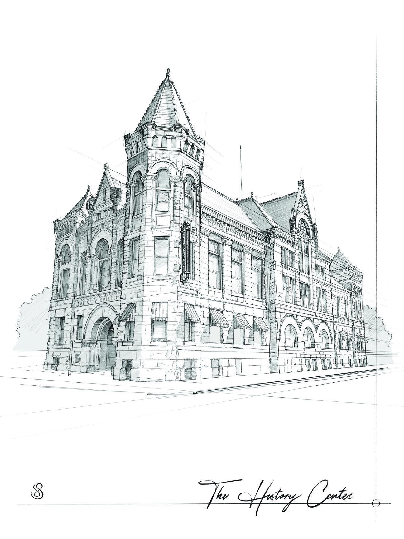 18x24” Hand drawn architectural sketch of Fort Wayne’s History Center, by artist J. Selzer.